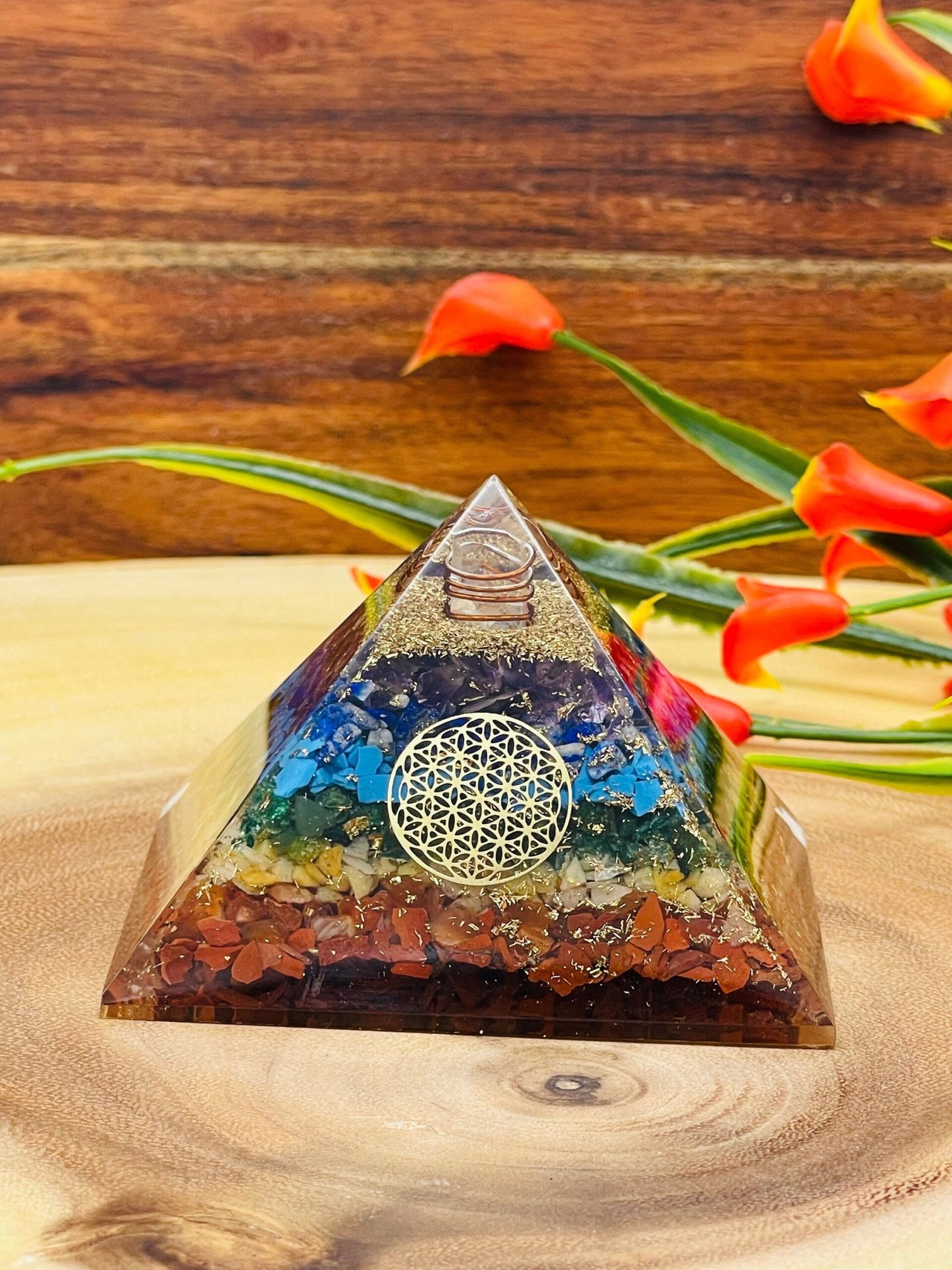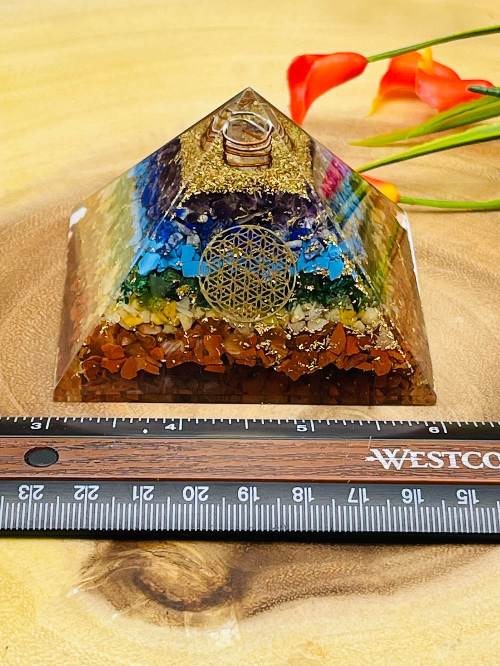 This Orgone 7 Chakra layered pyramid contain Red Jasper, Red Aventurine, Yellow Aventurine, Green Jade, Lapis Lazuli, Turquoise, Amethyst Crystals that helpful to heal and cleanse all 7 chakras.