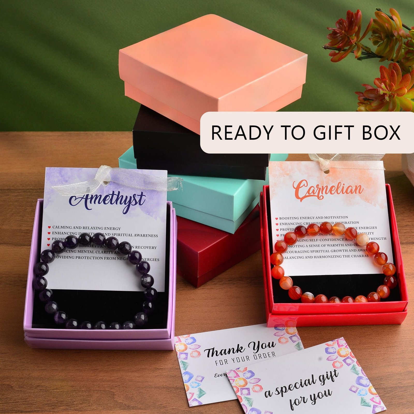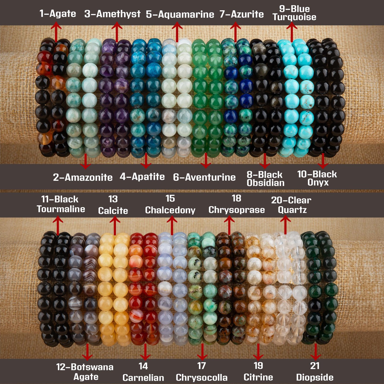 Our store features over 60 different original gemstones, each believed to have its own unique healing properties. To explore the benefits of each gemstone, visit the link below and discover the various bracelets made from these special stones. Our bracelets are crafted from gemstones, each with its own distinct healing attributes.