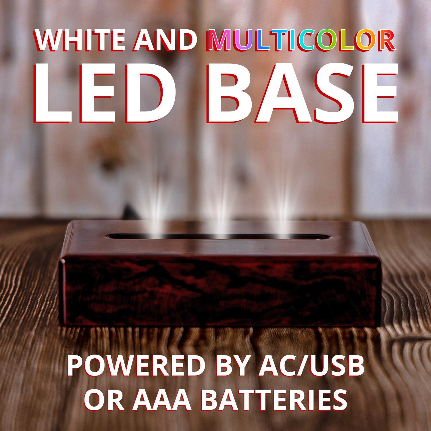 The light bases are made with high-quality materials to ensure durability and longevity. They are available in two different colors – Black and Rosewood – to suit your preferences and complement your 3D crystal. They can be powered with AAA batteries or with the USB adapter that comes included, so you can use them anywhere you want. The LED can light up in many colors, like a beautiful stationary white, or automatic change colors like red, green and blue, making your crystal even more customizable!