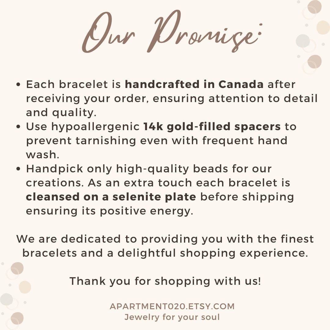We always strive to provide you with high-quality jewelry that is affordable. Each piece is crafted with love and care. Natural gemstones can vary in color and composition because they are formed by nature. However, your bracelet will be made to look very similar to the one in the picture. Our current processing time is 1-2 business days. We’ll ship them out as soon as your order is made, and you’ll be notified once the package has been shipped. Please feel free to contact me for any custom orders and questions.