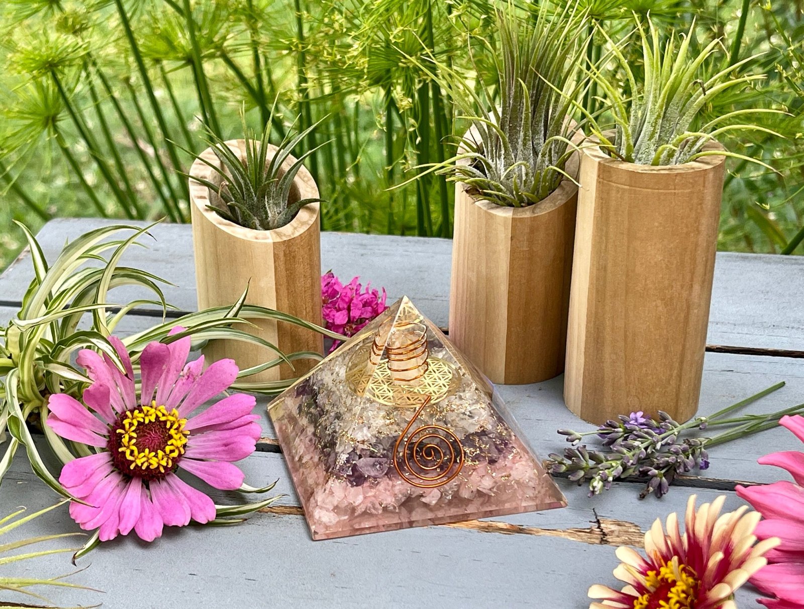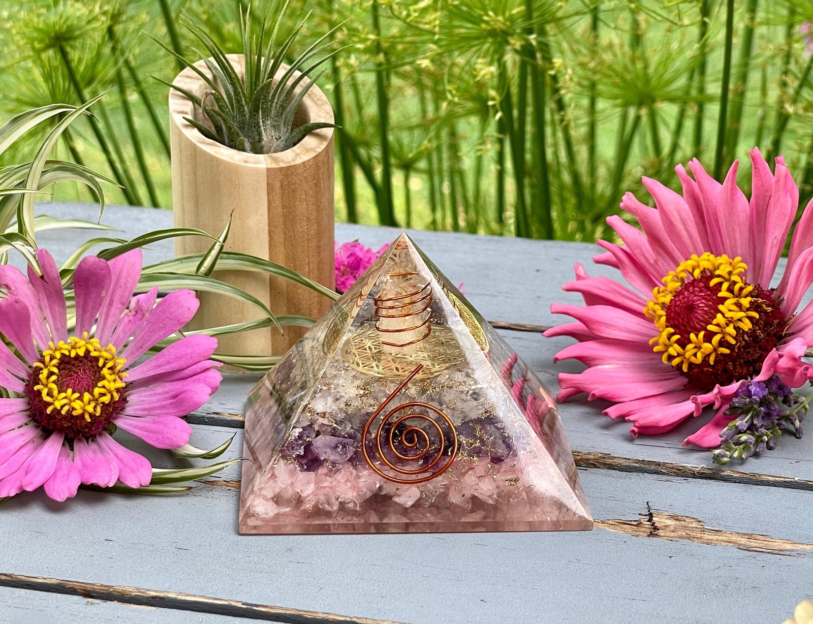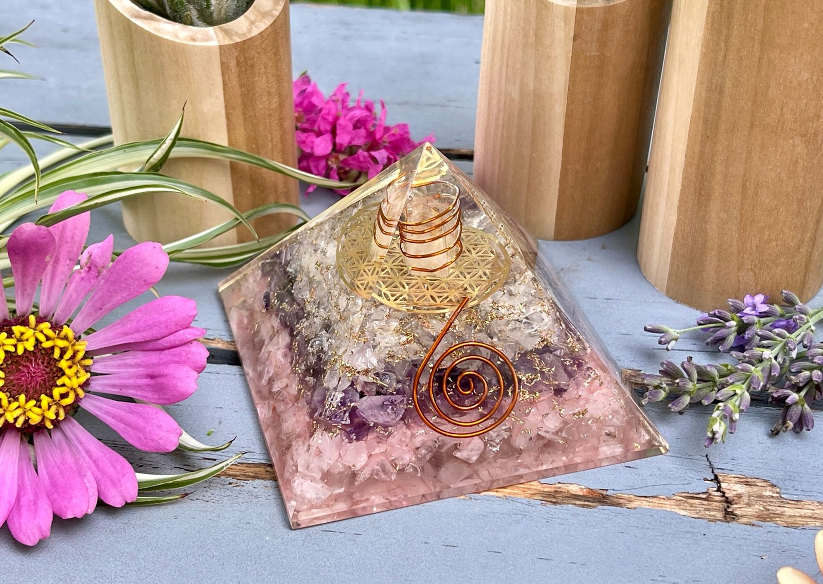 These Rose Quartz, Amethyst and Clear Quartz Orgonite Pyramids are extremely smooth orgonite and beautifully bright stones. The pyramids feature a crystal point with copper coil in front and copper bits all around it with natural crystals of Rose Quartz, Amethyst and Clear Quartz.