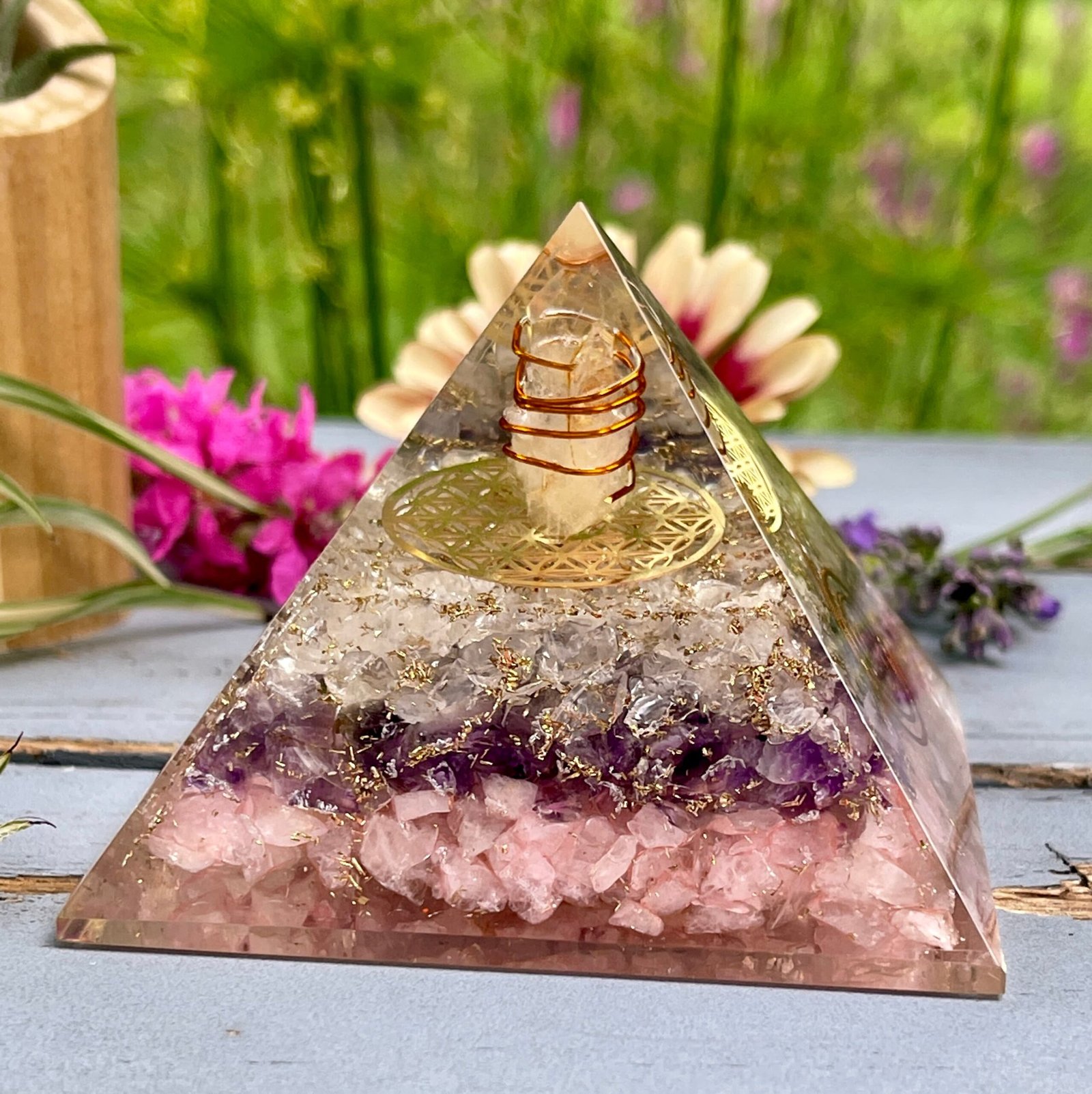Rose Quartz Amethyst Clear Quartz Orgonite Pyramid – EMF Protection – Crystal Pyramid – Toxic Energy Cleanser – Self Love